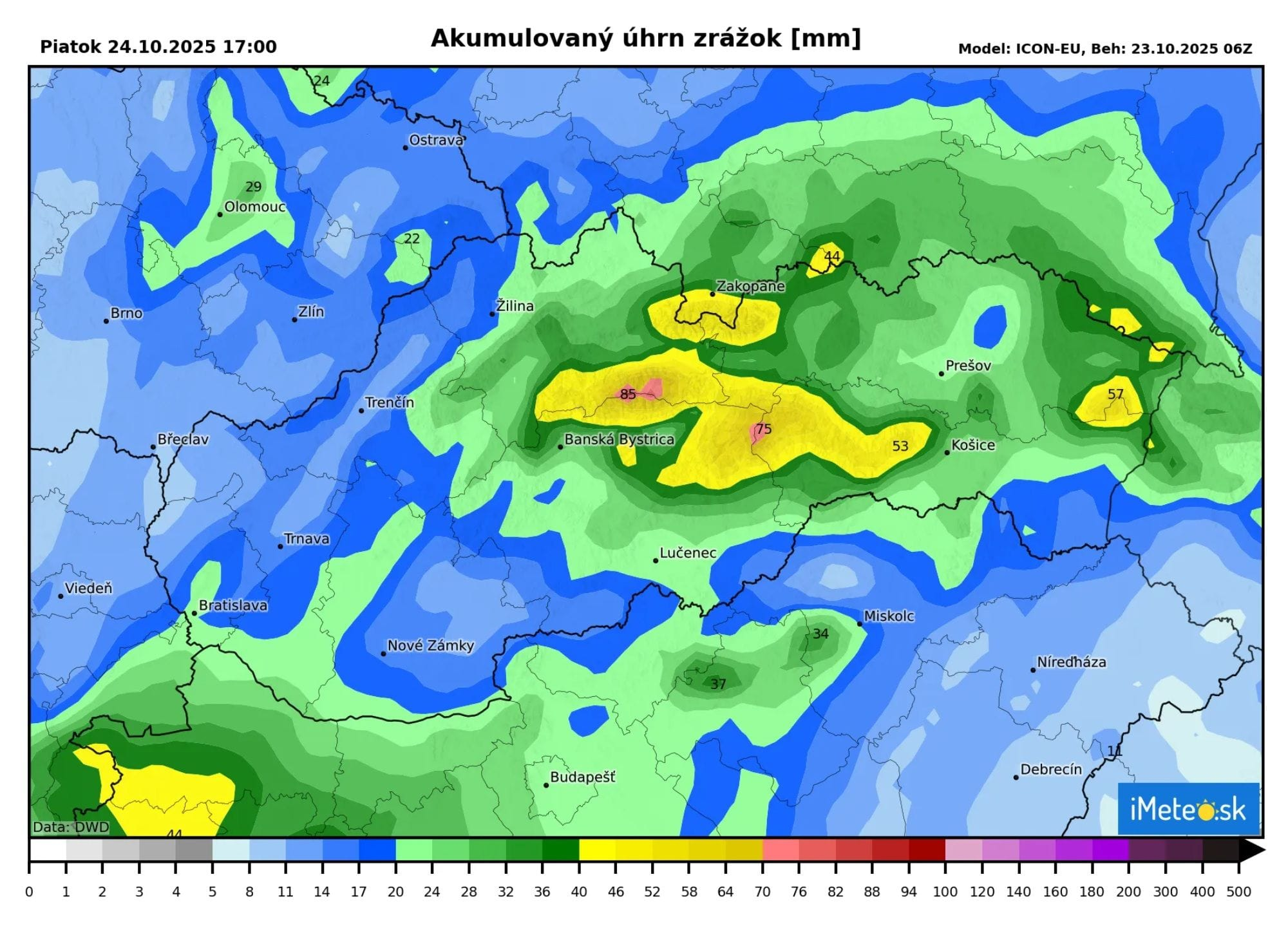 Najviac zrážok by malo spadnúť v oblasti Nízkych Tatier, kde by najnovšie mohlo spadnúť až 80 mm zrážok, čo je výrazne viac, ako odhadovali pôvodné predpovede. Aj na základe toho sme zvýšili varovanie pred dažďom pre okresy Liptovský Mikuláš, Poprad, Banská Bystrica, Brezno, Rožňava a Revúca.