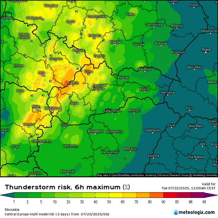 Na Myjave a v oblasti Považia je až 70 % pravdepodobnosť výskytu búrok. Na celom severozápadnom Slovensku sa pravdepodobnosť pohybuje okolo 50 %.
