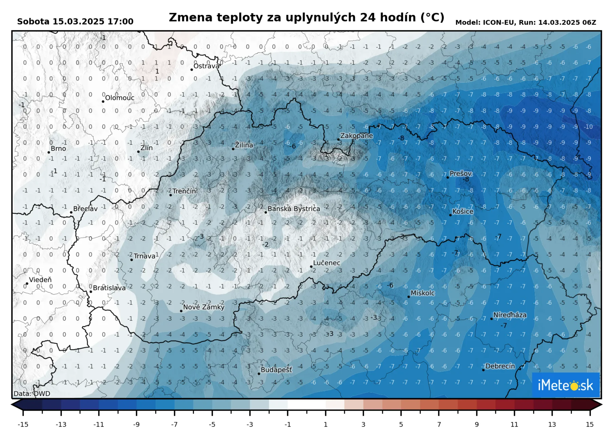 Chladný vzduch sa bude postupne presúvať nad ďalšie oblasti Slovenska a počas zajtrajšieho popoludnia sa už výrazne ochladí aj na východe. Maximálne teploty sa v sobotu dostanú len na +3 až +10 °C, čo predstavuje pokles až o 8 °C.