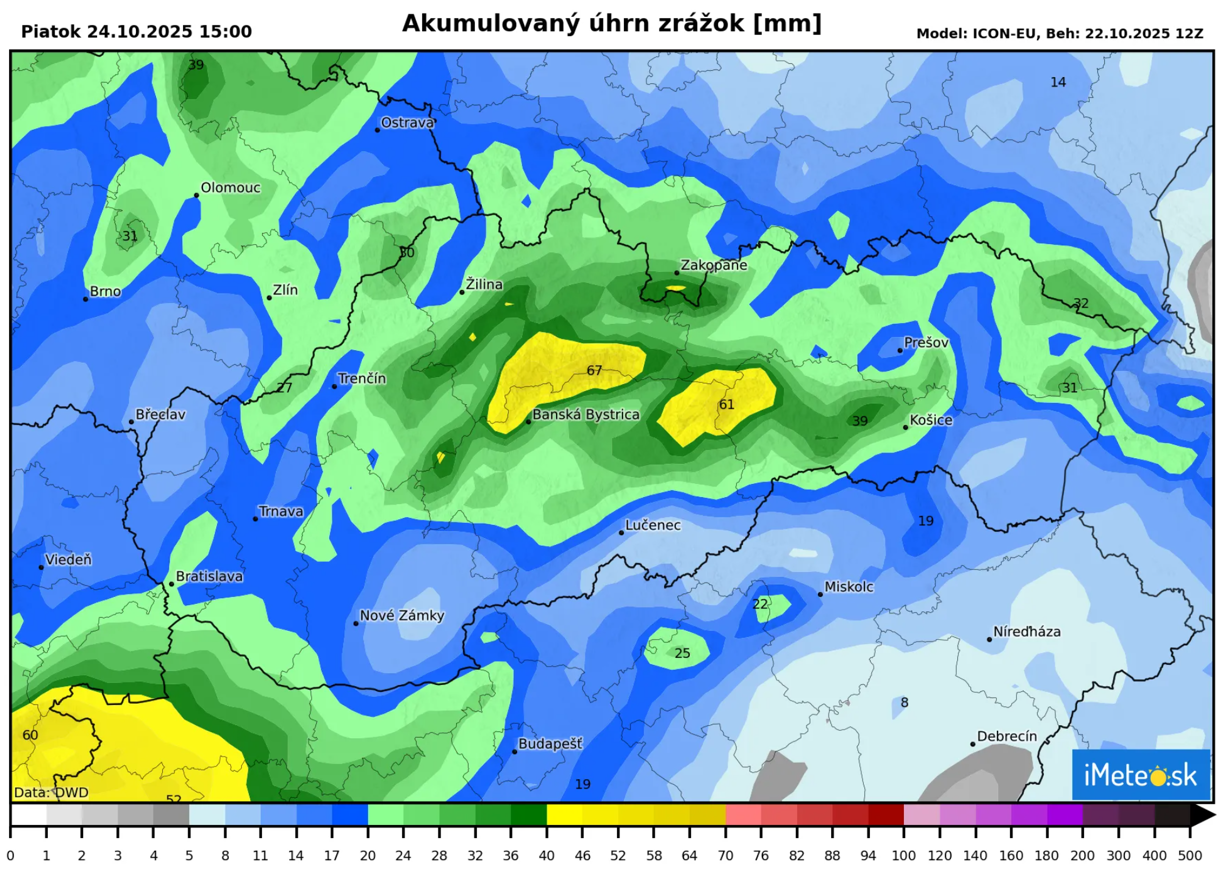 Počas noci by mohlo na našom území spadnúť 20 až 40 mm, no lokálne až okolo 50 mm zrážok, a to predovšetkým v okolí Nízkych Tatier a na Gemeri.