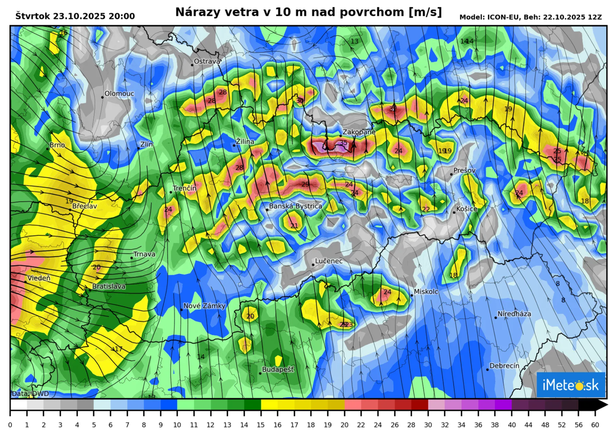Na čele studeného frontu bude výrazne silnieť vietor, ktorý napríklad v okolí Viedne dosiahne nárazy aj cez 100 km/h. Na Slovensko dorazí tento vietor okolo 20:00 a v nižších polohách sa očakávajú nárazy s rýchlosťou okolo 80 km/h, no v oblasti Malých Karpát môže fúkať až s poryvmi 120 km/h.