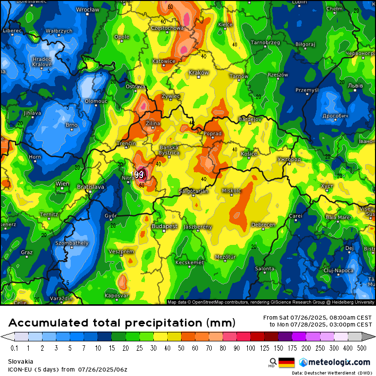 My sa prikláňame skôr ku českému Aladinu, ktorý taktiež odhaduje, že najviac zrážok spadne na severozápade a severe Slovenska, no úhrny by sa mali pohybovať od 80 do 130 mm zrážok.