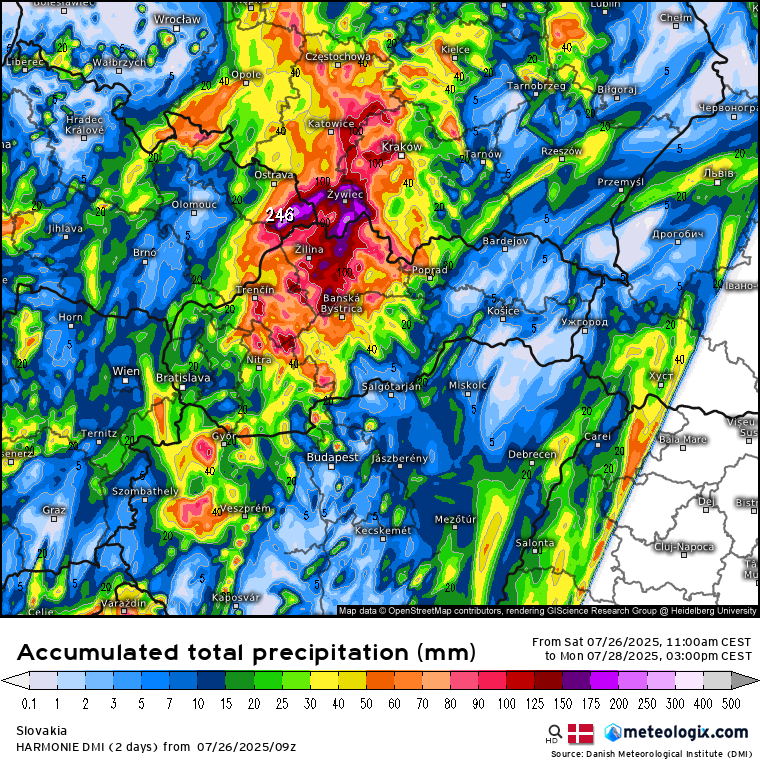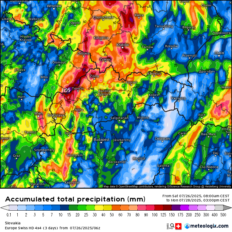 Všimnúť si môžete, že najmenej zrážok predpovedá nemecký model ICON-EU. Švajčiarsky SwissHD, podobne ako dánsky Harmonie očakáva ťažisko zrážok na severozápade až severe Slovenska, kde by mohlo spadnúť 150 až 200 mm zrážok.