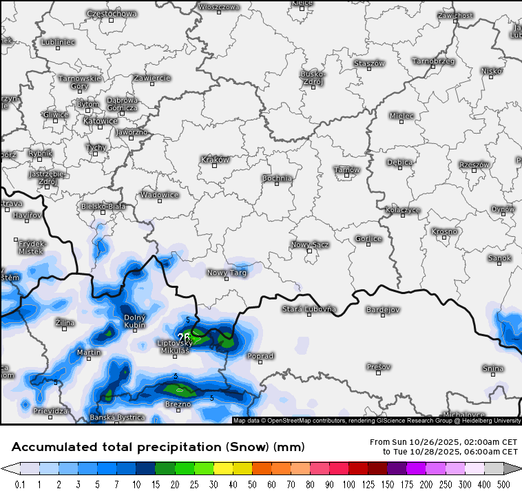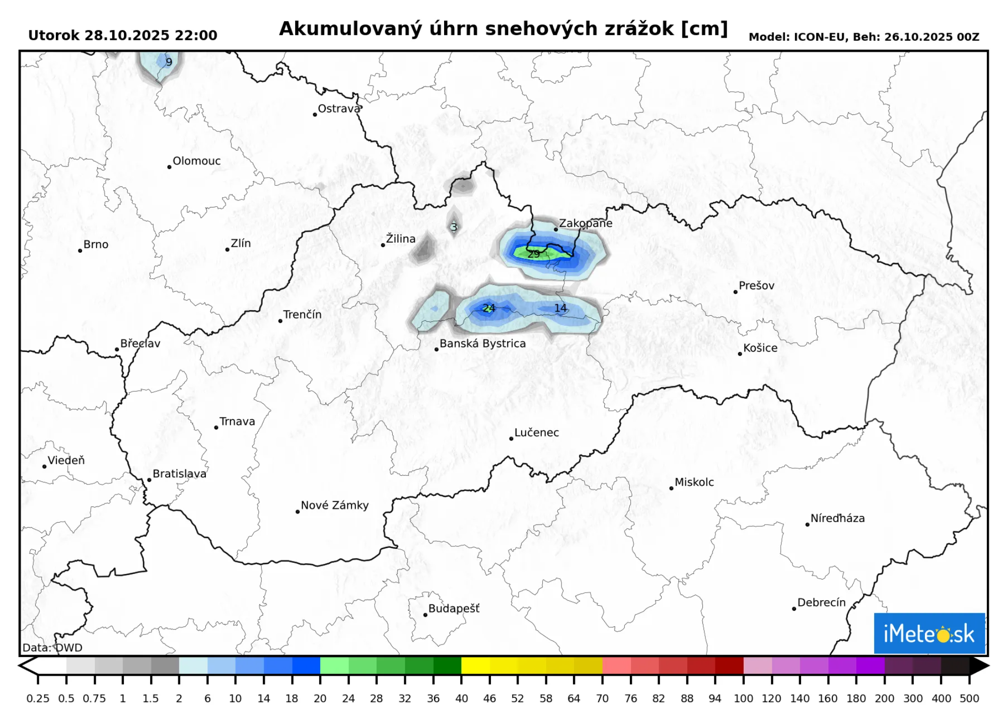 Presne takáto situácia sa zajtra čaká. Od zajtrajšieho poludnia sa očakávajú najmä na severe zrážky, ktoré budú od 800 metrov snehové. Zrážky budú výrazné a do utorkového rána môžu priniesť 10 až 30 mm zrážok, ktoré budú vo vyšších polohách vo forme snehu.
