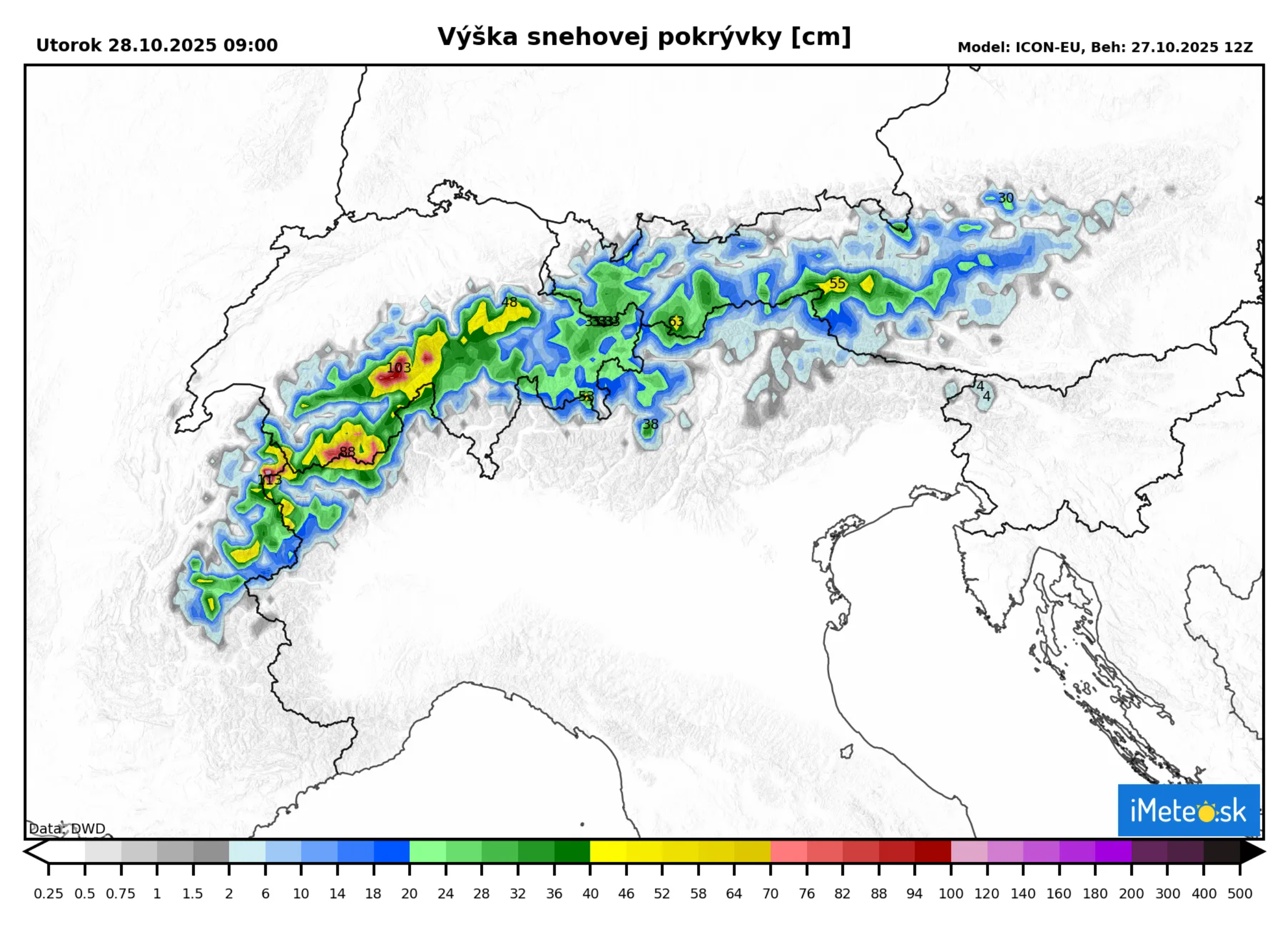 Najmä medzi Allgäuskými Alpami na severe a Silvrettou na juhu, sa očakáva, že dnes napadne ešte 40 až 50 centimetrov čerstvého snehu.