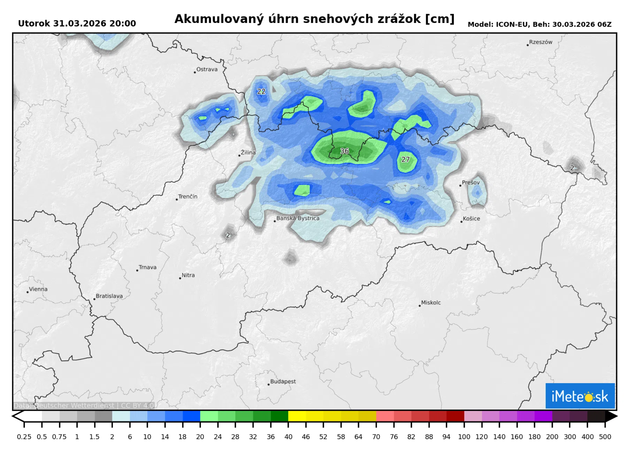Do zajtrajšieho večera by malo napadnúť 10 až 15 cm snehu, no v niektorých oblastiach na náveterných stranách, napríklad na Orave, vo Vysokých Tatrách či v Nízkych Tatrách, by mohlo napadnúť aj okolo 20 cm čerstvého snehu, čo je pekne vidieť na mape.