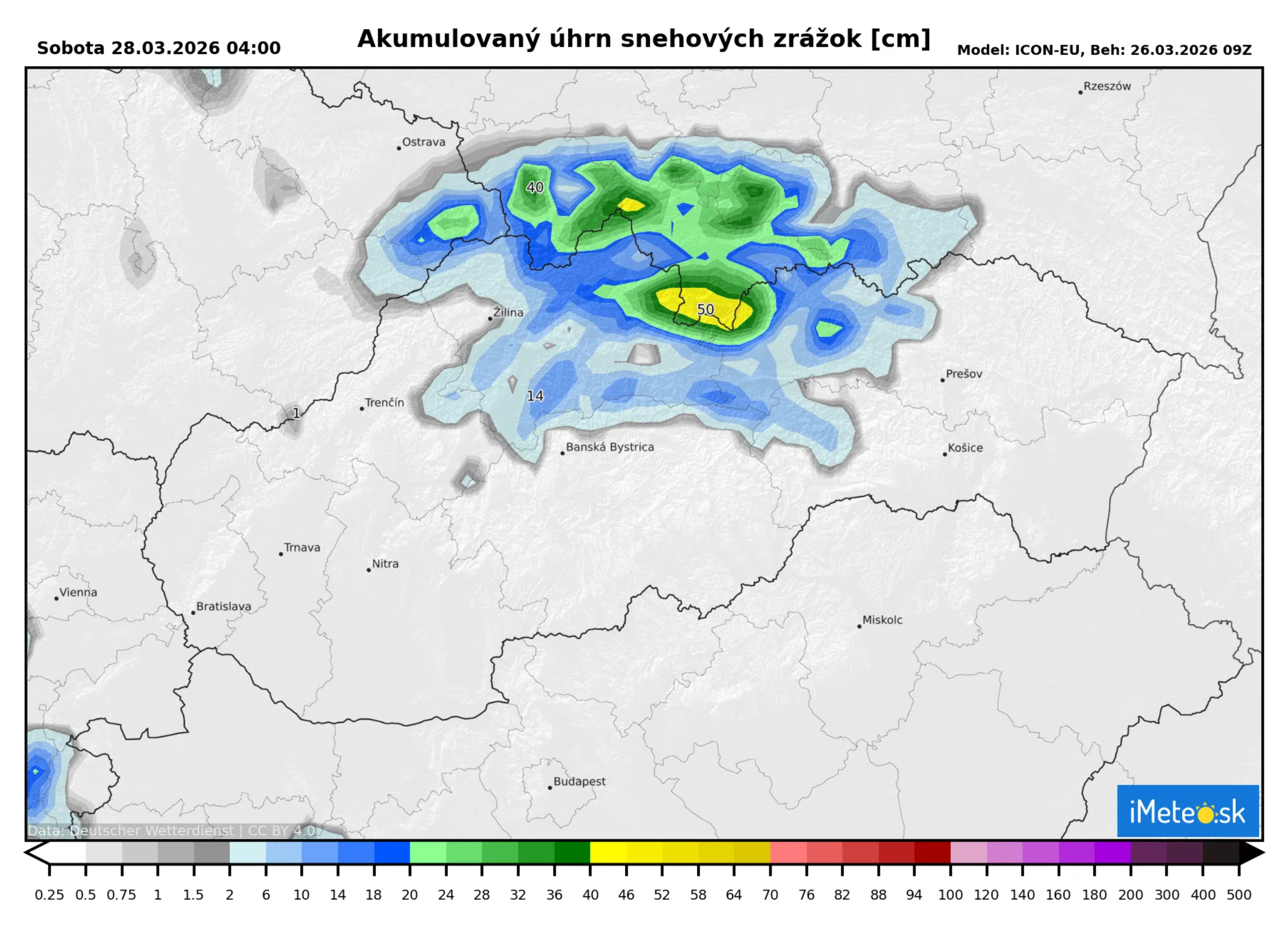 Ešte včera presnejšia verzia ICON-D2 predpovedala v Malých Karpatoch okolo 30 cm, no aktuálna prognóza už počíta len s približne 10 cm.