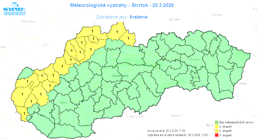 Aktuálne je v platnosti výstraha SHMÚ (dnes od 18:00 do zajtra 10:00), ktorá očakáva, že v severozápadných okresoch vrátane vyššie položených častí Bratislavy napadne 5 až 10 cm snehu.