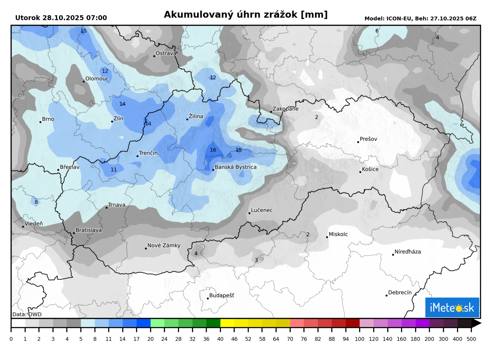 Na našom území spadne priemerne do 5 mm zrážok, ale v oblasti Trenčianskeho, Žilinského a na severe Banskobystrického kraja by mohlo spadnúť až takmer 20 mm zrážok.