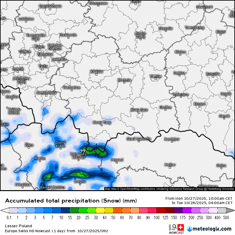 Nakoľko sa stále nachádzame v studenom prúdení, tak hranica sneženia sa lokálne nachádza aj pod nadmorskou výškou 1000 m n.m.