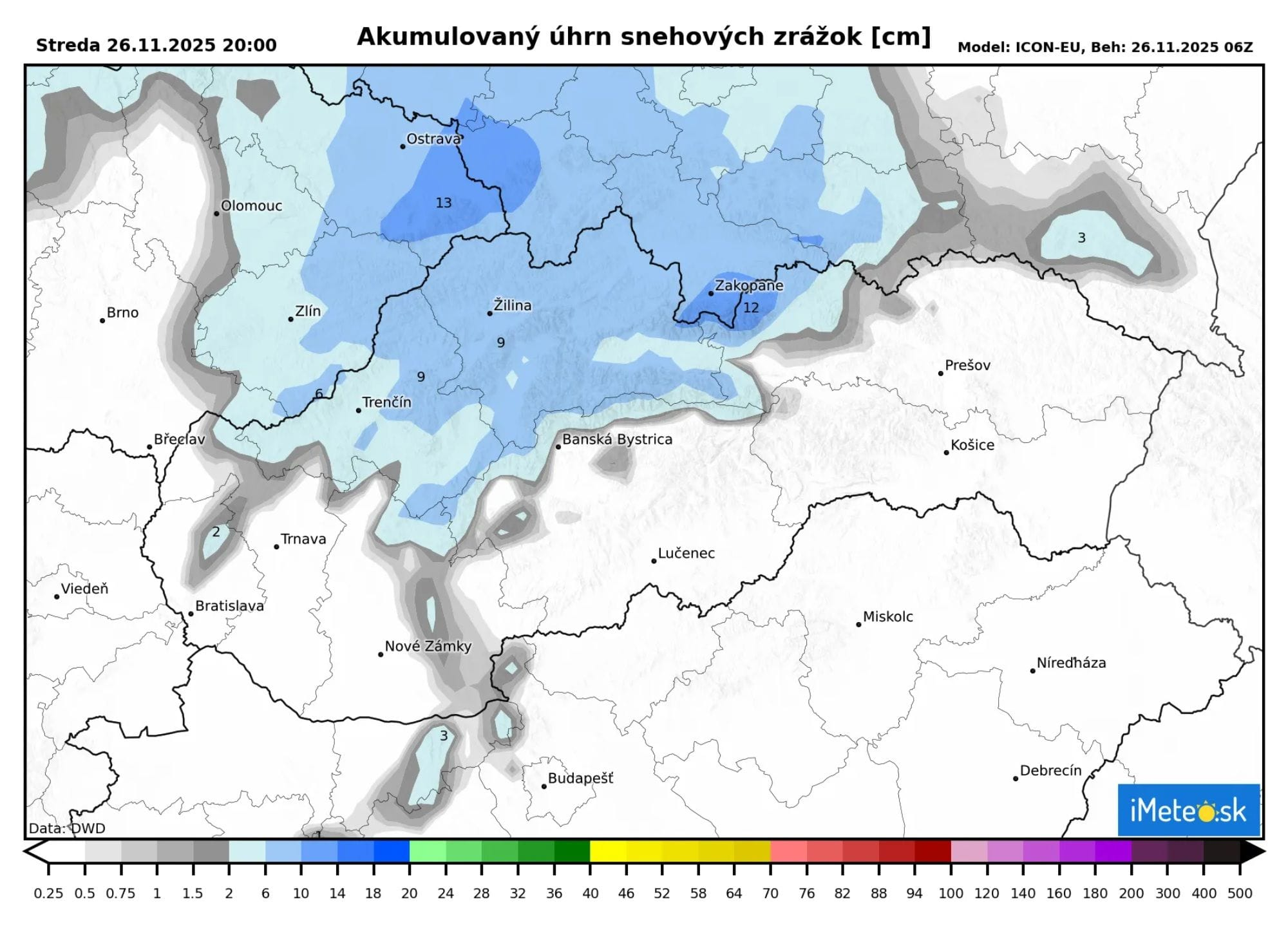 Sneženie by však aj tu malo postupne ustávať. Udeje sa tak po 15:00, kedy sneženie prejde do snehových prehánok a na večer definitívne ustane.