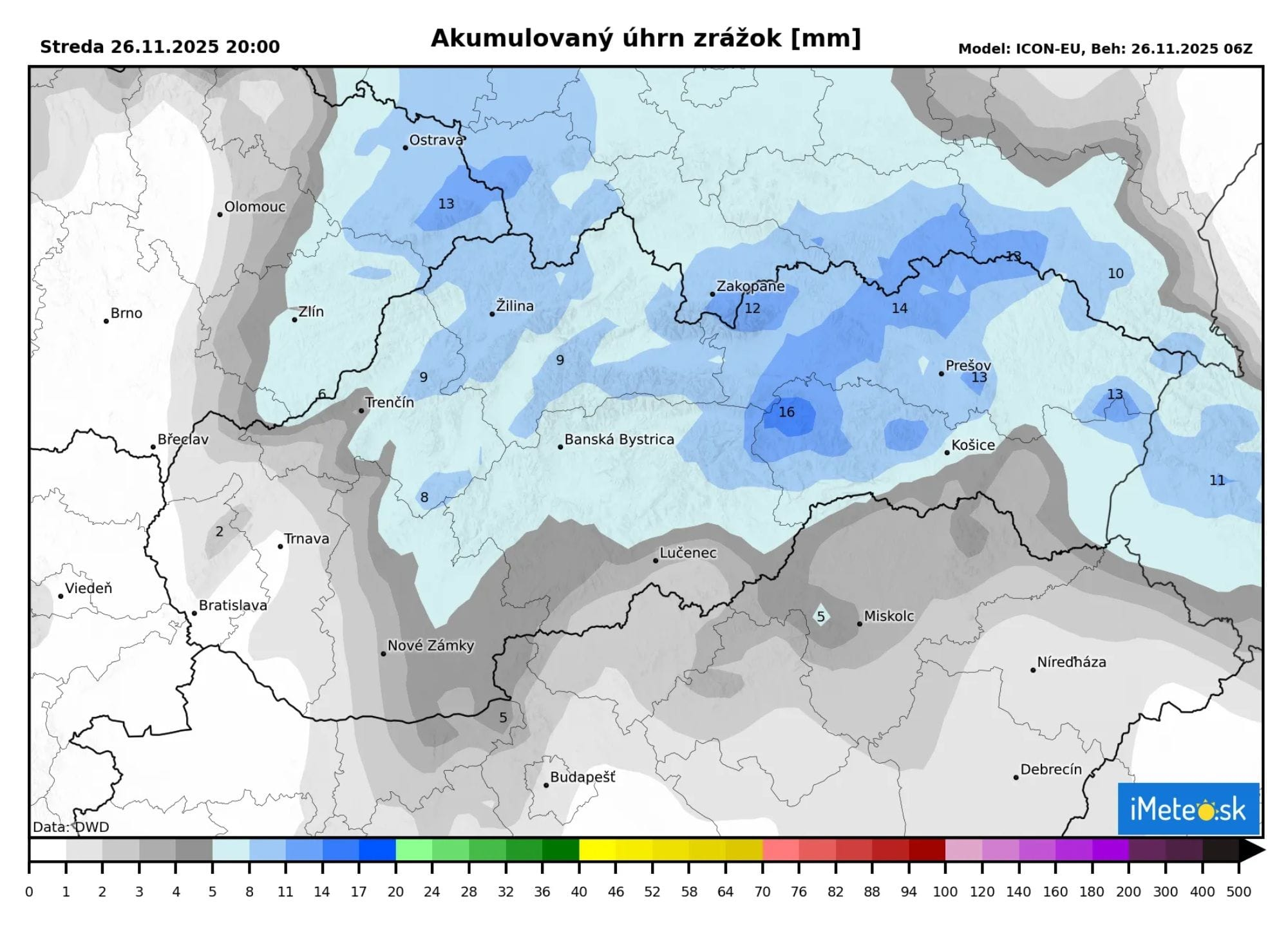 Nasledujúce hodiny sa očakávajú zrážky ešte predovšetkým na strednom a na východnom Slovensku. Zatiaľ čo na západe krajiny spadnú už len jednotky milimetrov zrážok, tak na strednom a na východnom Slovensku nám môže spadnúť ešte ďalších 5 až 15 mm a to predovšetkým v centrálnej časti krajiny.