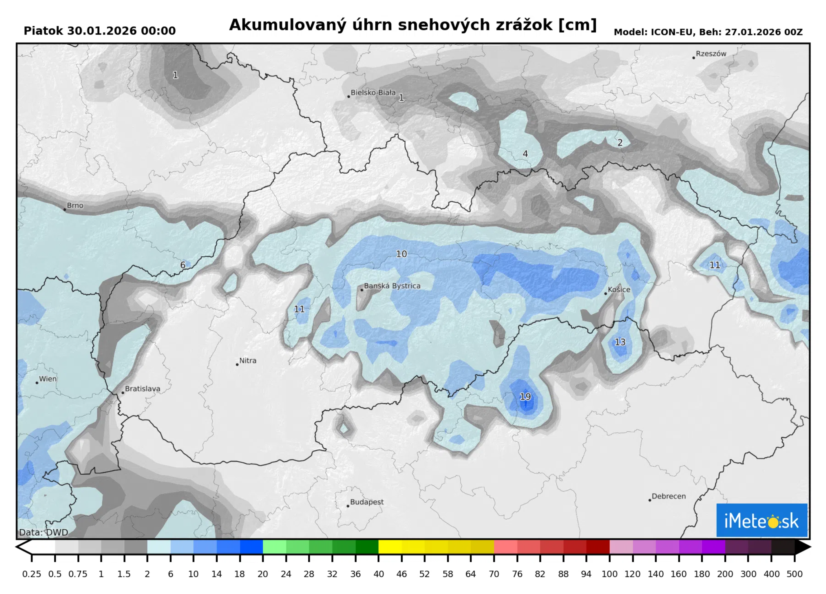 Vidieť, že množstvo zrážok sa ešte upresňuje, no numerické modely sa zhodujú v tom, že najviac snehu napadne na Záhorí a na juhu stredného a východného Slovenska.