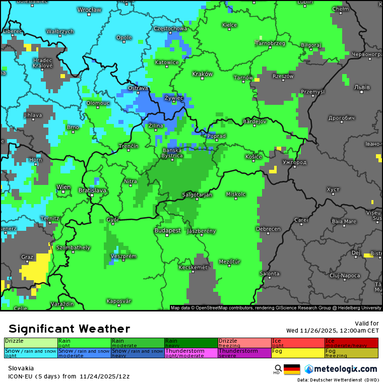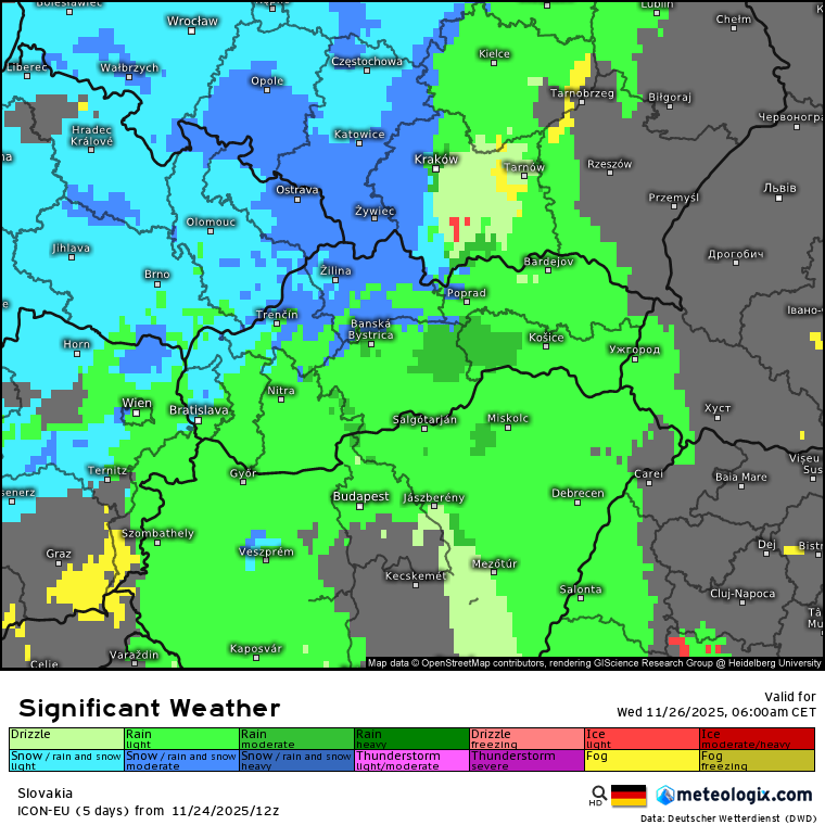 Tento príliv chladného vzduchu spôsobí, že na našom území začne opäť klesať hranica sneženia a dážď bude prechádzať do sneženia.