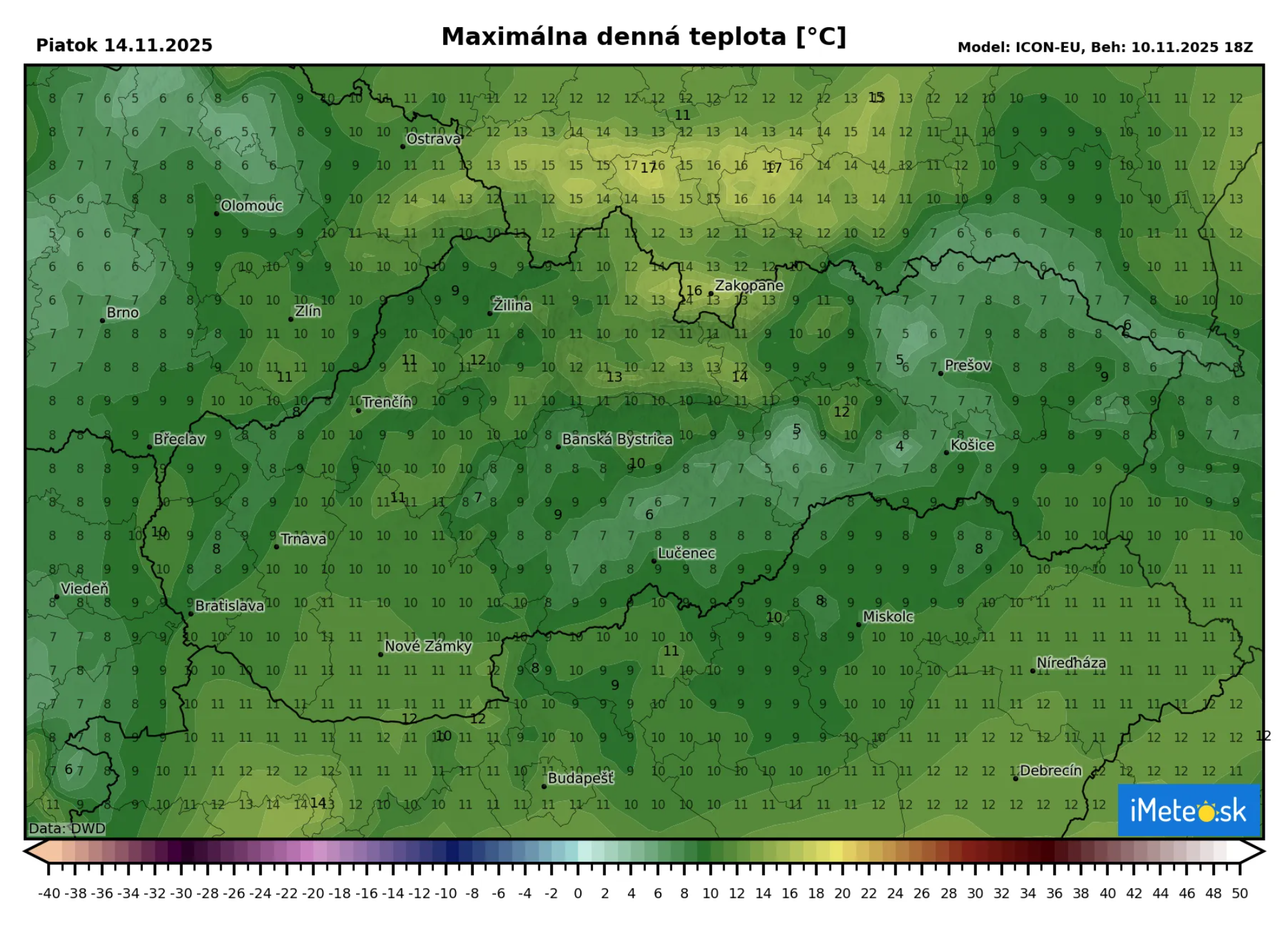 Ako môžete vidieť na mape, tak vo štvrtok a v piatok by na severe a na horách pri vyjasnení mohlo byť teplejšie ako na juhu, kde sa očakáva nízka oblačnosť.