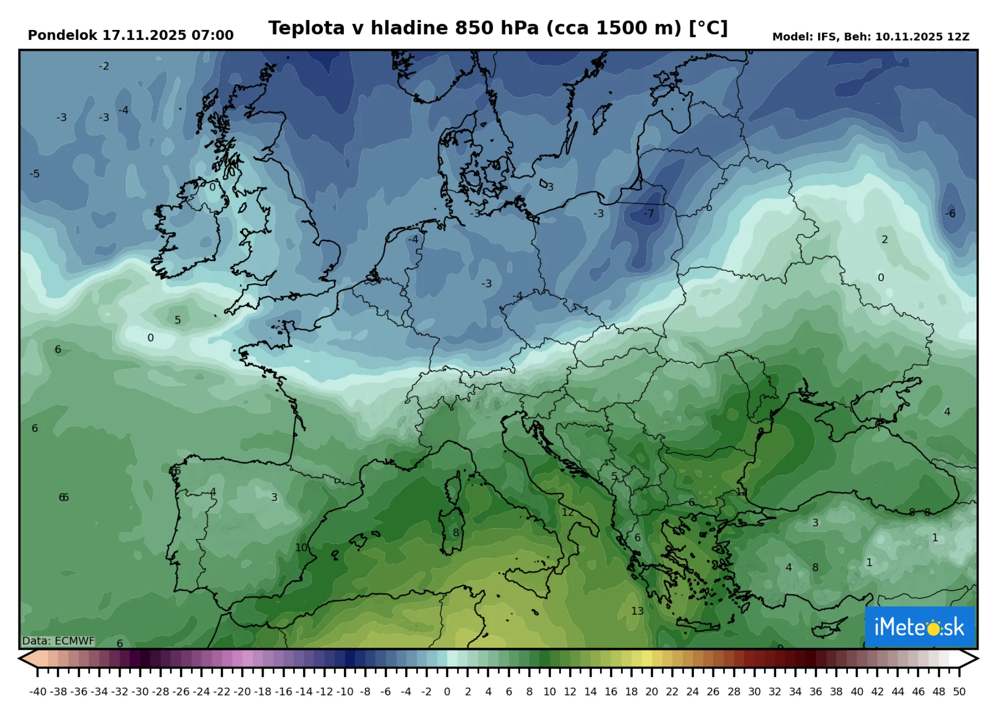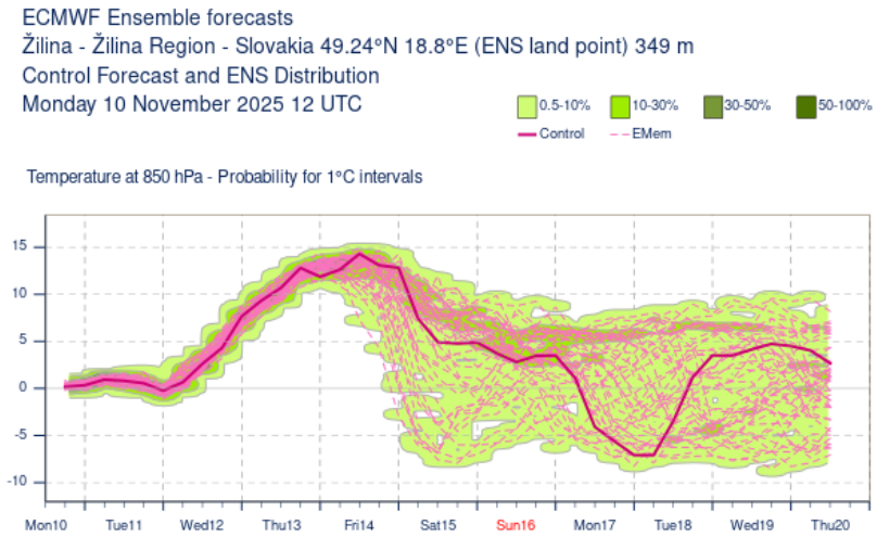 Vývoj od víkendu je aktuálne zaťažený veľkou neistotou, čo ilustrujeme na ansámbli teploty v hladine 850 hPa. Vďaka tejto hladine môžeme lepšie pozorovať, akú teplotu dosahuje vzduchová hmota vo výške 1 500 metrov, ktorá prúdi nad naše územie.