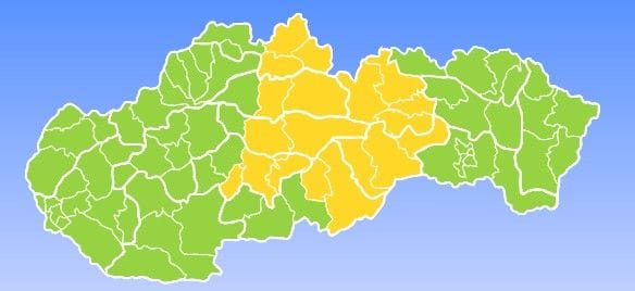 V ohrození sú predovšetkým typicky najchladnejšie oblasti nášho územia na severnom a na strednom Slovensku. V žlto vyznačených okresoch tak počítajte s výskytom prízemného mrazu.