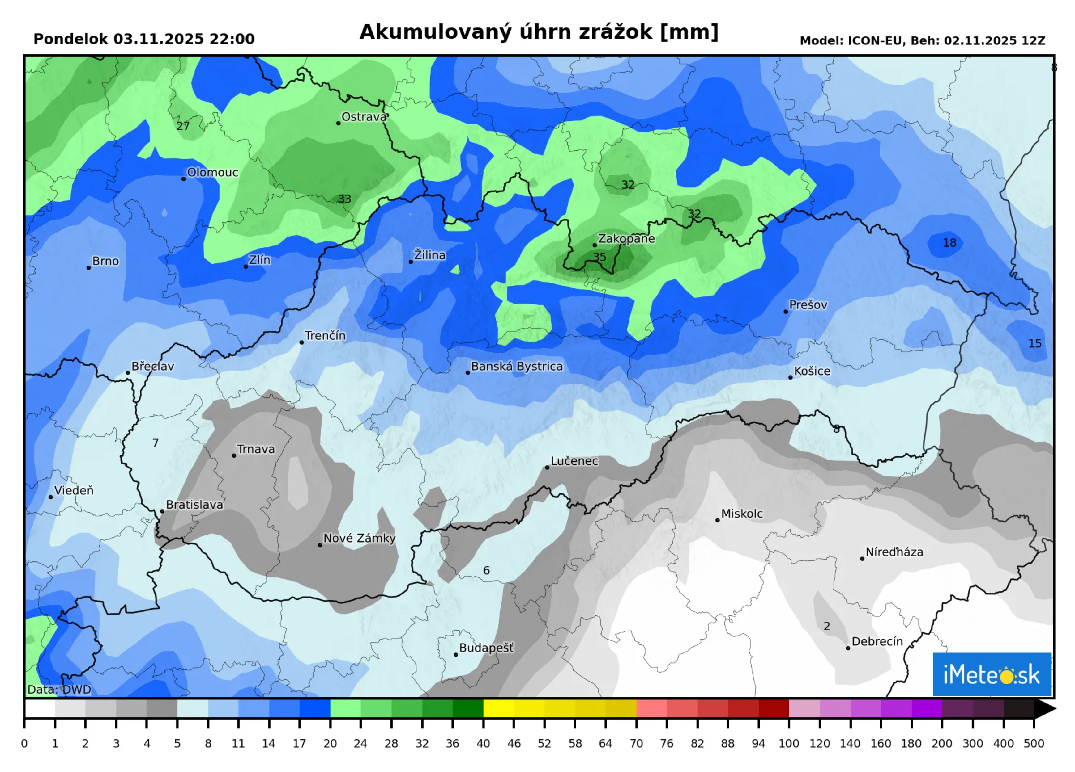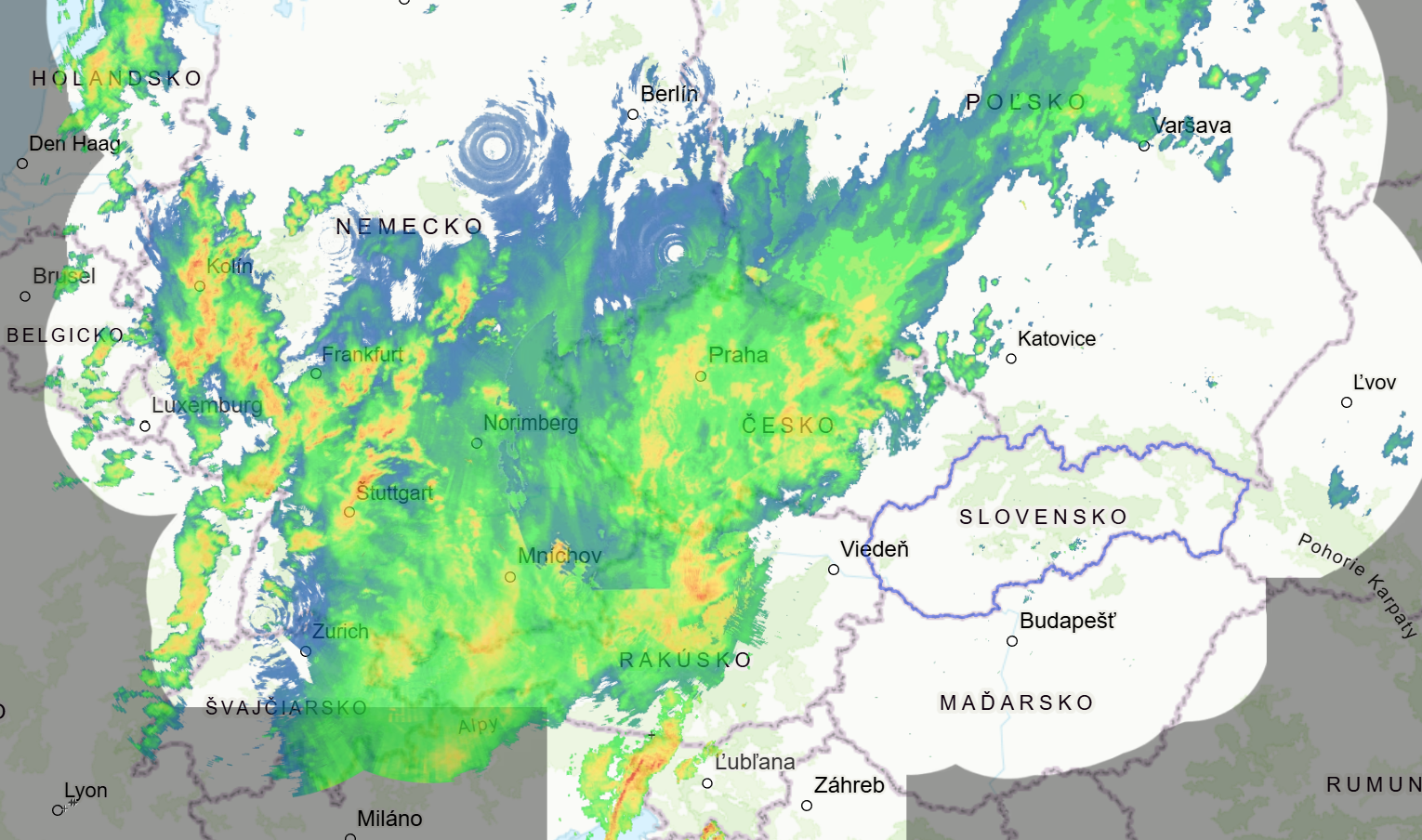 Za hranicami Slovenska sa už nachádza rozsiahle zrážkové pole studeného frontu, ktoré počas dnešného dňa prináša upršané počasie do Nemecka, do Rakúska a aj do Česka. V Alpách od výšky zhruba 2 500 metrov výdatne sneží.