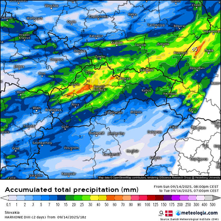 Ešte v utorok dopoludnia však budú zrážky od západu ustávať. Numerické modely predpovedajú, že na našom území môže spadnúť od 10 do 25 mm zrážok, no detailnejšie numerické modely ako Aladin, či model Harmonie predikujú, že na strednom Slovensku, v oblasti hôr môže spadnúť aj viac ako 50 mm zrážok.