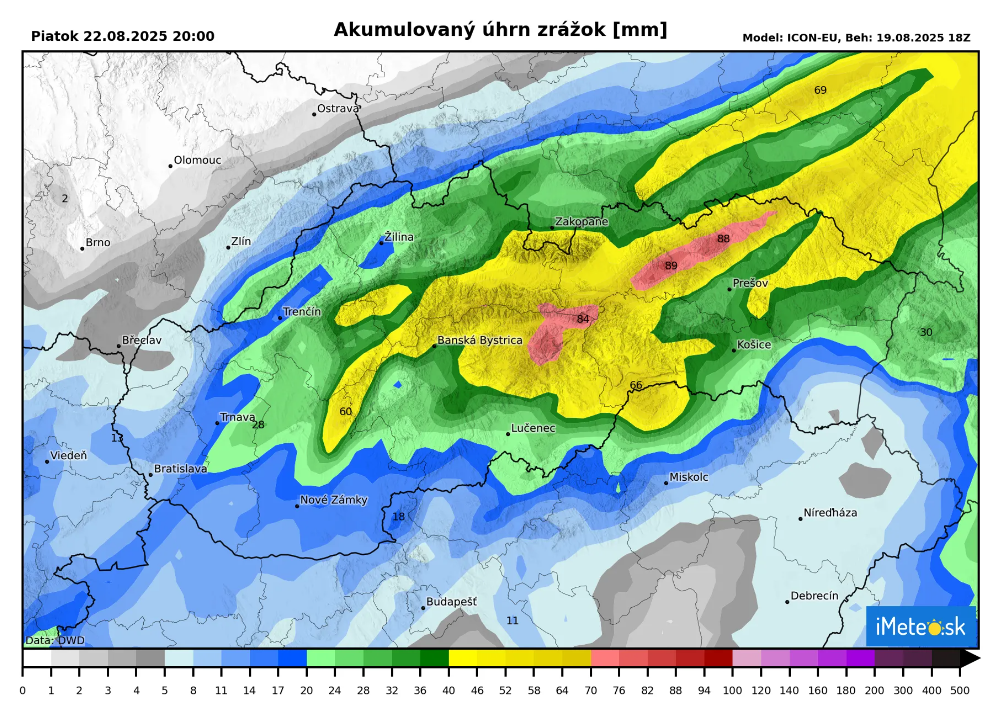 Na vyššie priloženej mape môžete vidieť očakávané zrážkové úhrny, no ťažisko sa ešte mení a upresňuje. Každopádne najviac zrážok spadne v oblasti hôr.