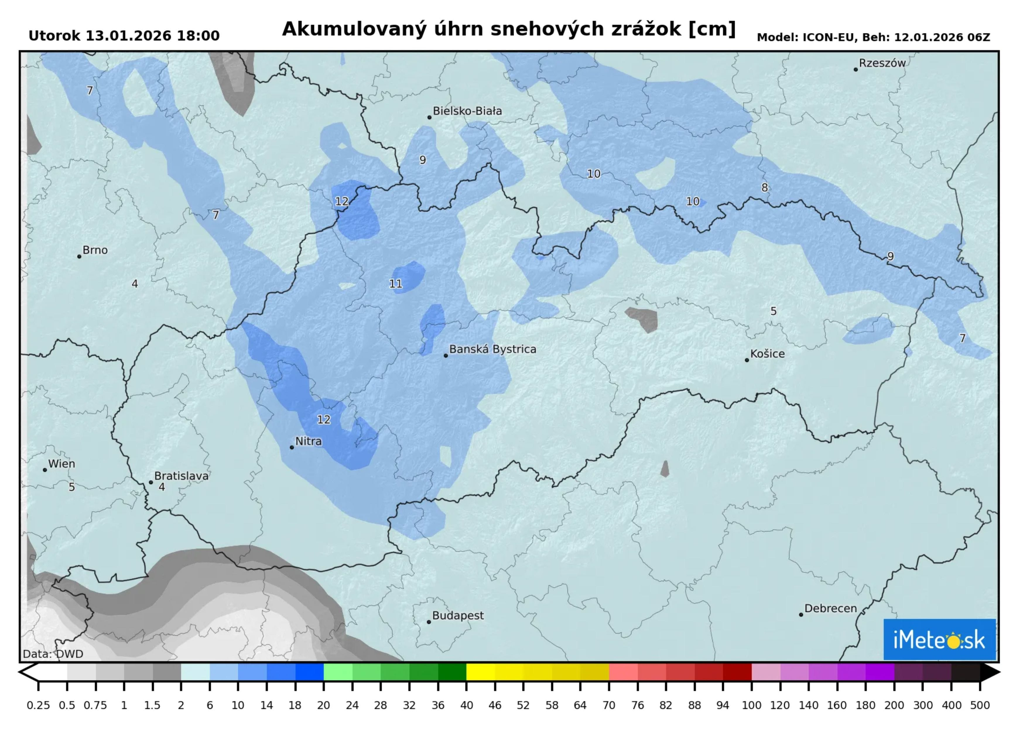 Pekne to vidieť aj na mape snehu. Zatiaľ čo na väčšine územia napadne do 5 cm snehu, na severe to bude do 10 cm a v oblasti Trenčianskeho a Nitrianskeho kraja môže napadnúť aj okolo 12 cm čerstvého snehu.