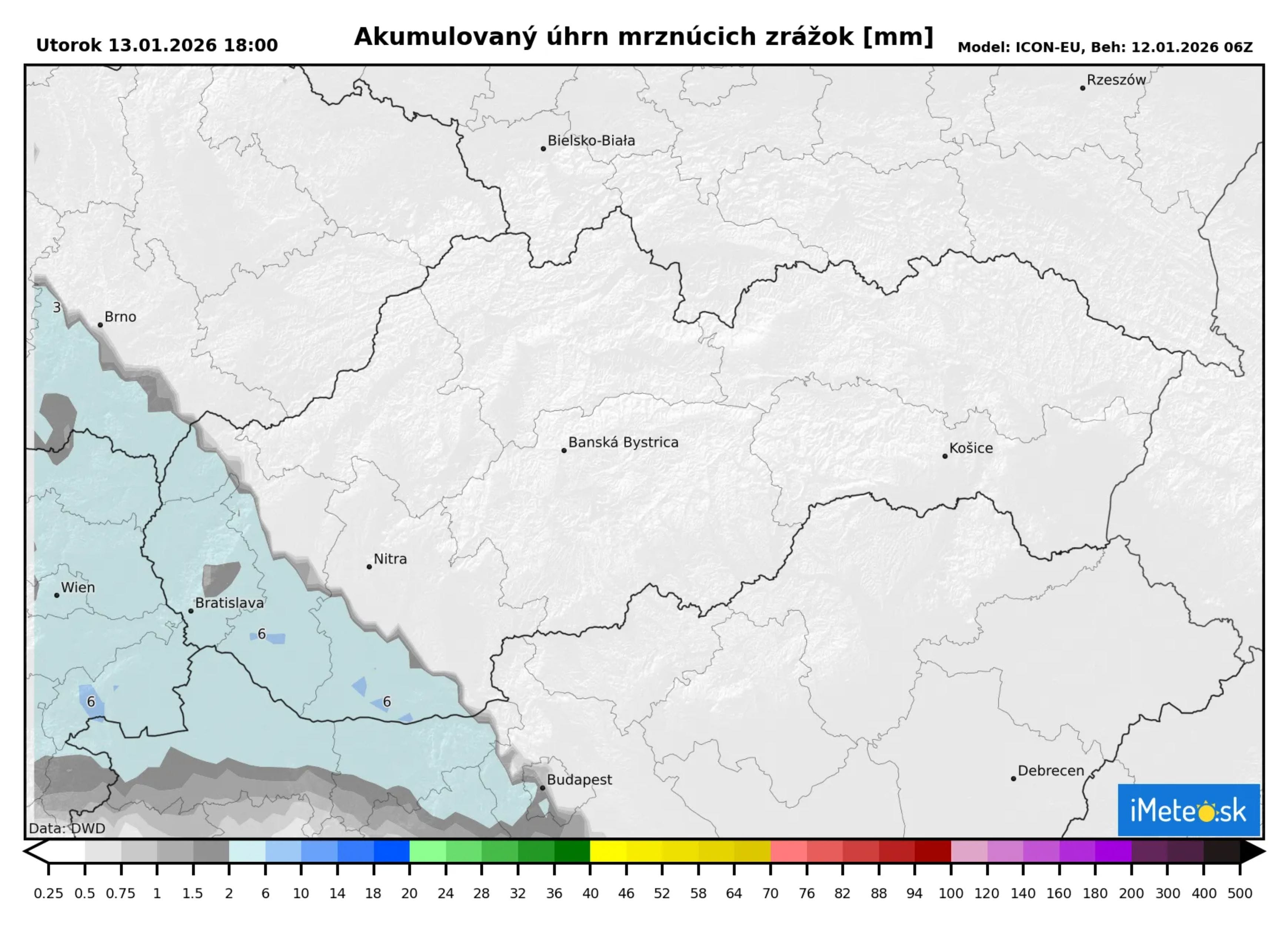 Na mape očakávaných mrznúcich zrážok je pekne vidieť oblasti, kde sa bude vyskytovať mrznúci dážď. Pôjde výlučne o krajný západ, kde spadne 6 mm zrážok vo forme mrznúceho dažďa.