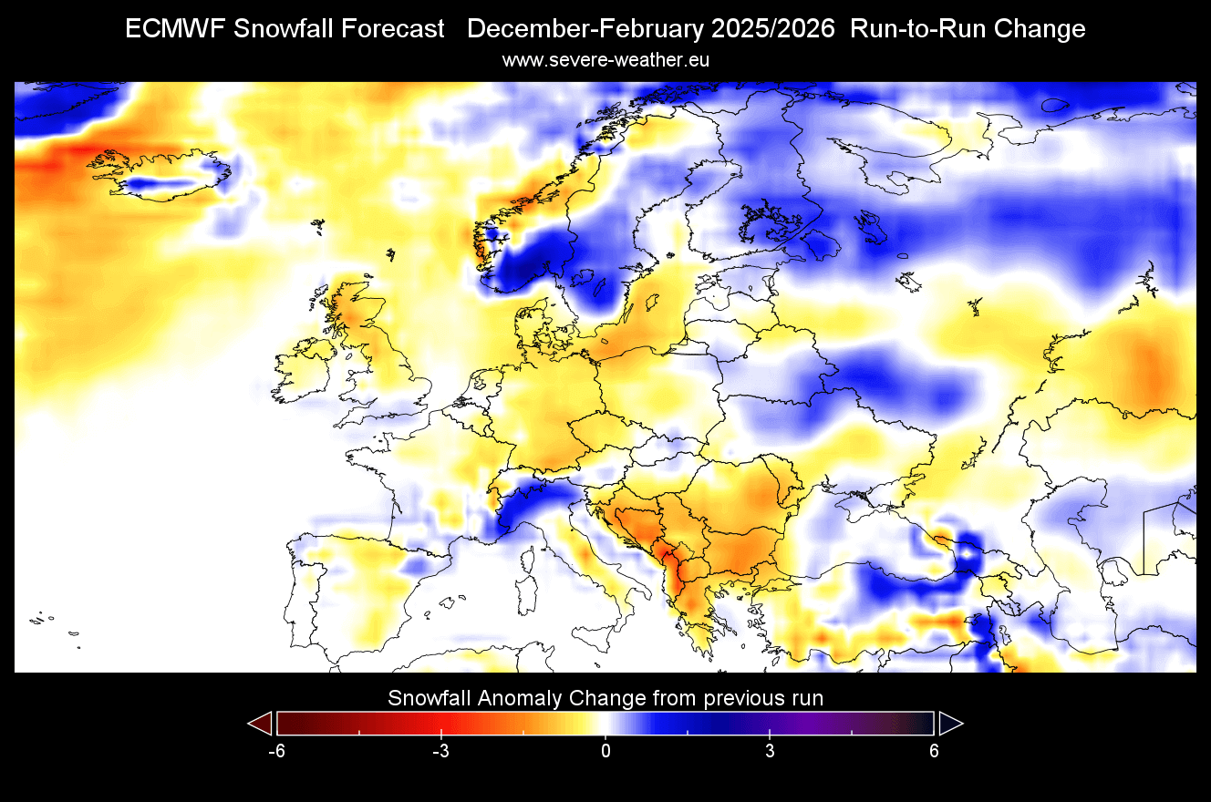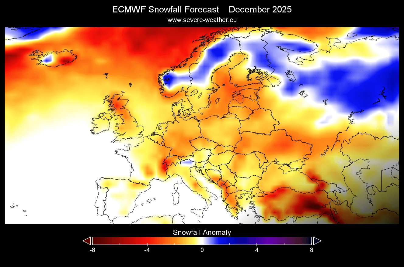 Pozrime sa najnovšie mapy a vyhliadky pre zimu 2025/2026 podľa modelov UKMO a ECMWF. Decembrová predpoveď sneženia podľa modelu ECMWF ukazuje prevažne negatívne anomálie s výnimkou ďalekého severu.
