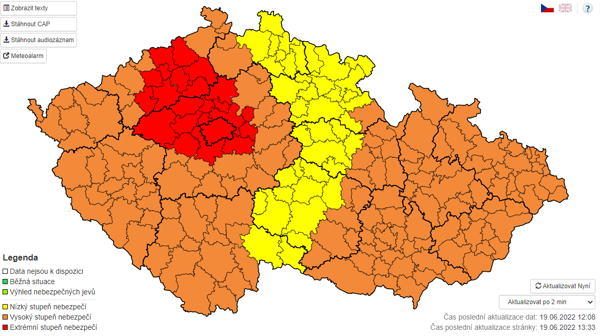 Mimoriadne vysoké teploty očakávajú v Česku počas dnešného a čiastočne aj zajtrajšieho dňa. Najmä v západnej polovici Čiech budú teploty prekračovať +34 °C, v časti Stredočeského a Ústeckého kraja aj +37 °C, preto tu platí výstraha s extrémnym stupňom nebezpečenstva. Ešte v pondelok budú maximálne teploty prekračovať +31 ° C na juhu Moravy.