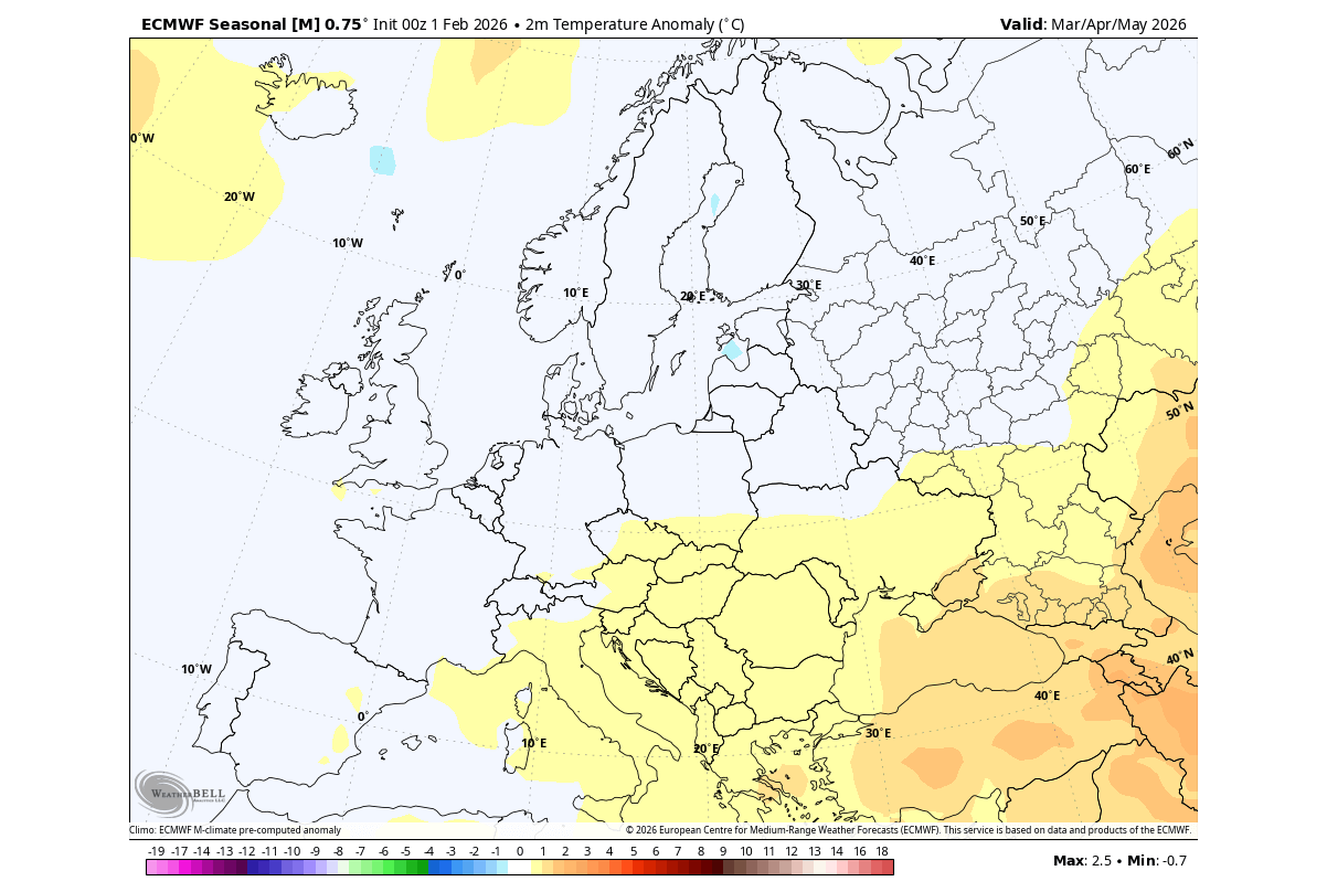 Sezónne modely ECMWF a UKMO sa vzácne zhodujú v tom, že kým juhovýchod kontinentu si užije teplejšie prúdenie, severná a stredná Európa sa musia pripraviť na chladnejší štart jari s rizikom mrazov a neskorého sneženia.