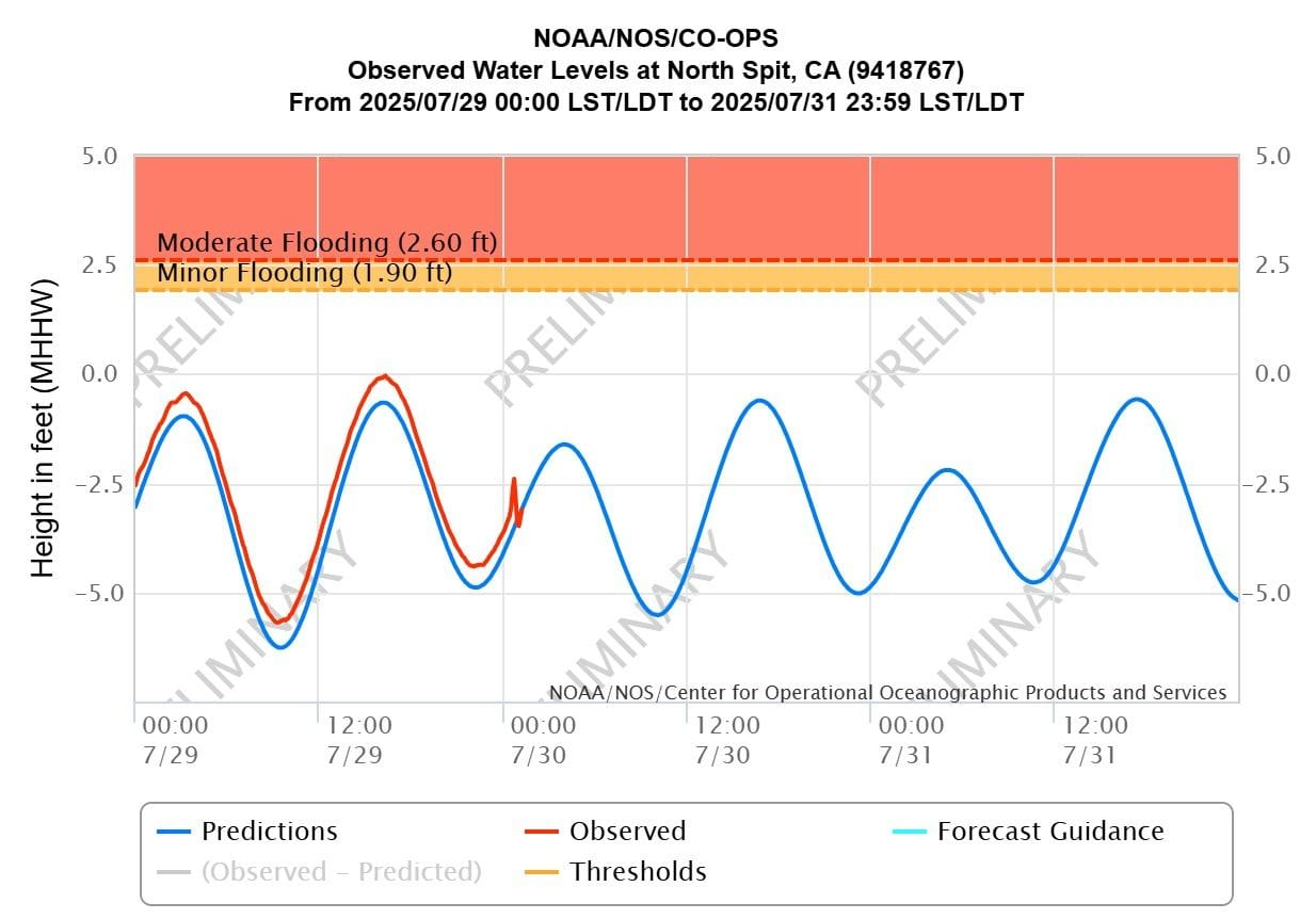 Podľa údajov Národnej meteorologickej služby (National Weather Service) tu bola pozorovaná vlna s výškou viac ako jedna stopa (približne 30 cm) a očakáva sa príchod ďalších vĺn.