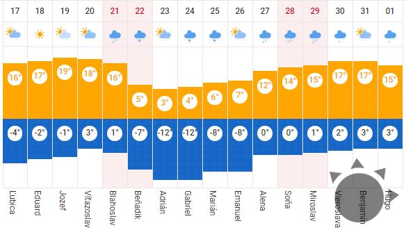 Nasledujúce dni tak bude najteplejšie zajtra, čiže v piatok, kedy maximálne teploty dosiahnu +14 až +20 °C. Naopak najchladnejší by mal byť pondelok, kedy sa teploty budú pohybovať od -2 do +5 °C. Na severe sa tak očakáva celodenný mráz.