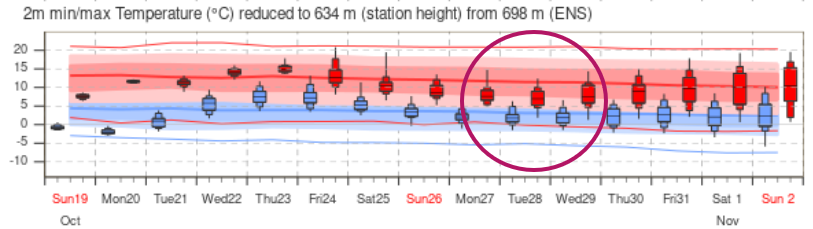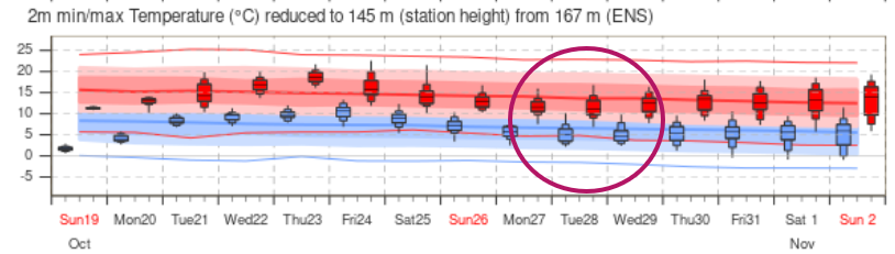 To by malo zraziť teploty výrazne pod hranicu dlhodobého normálu. Naznačujú to aj aktuálne ansámble európskeho predpovedného modelu ECMWF. Ako si môžete všimnúť na diagrame z Bratislavy, tak teploty okolo 28. októbra budú pod hranicou dlhodobého normálu.