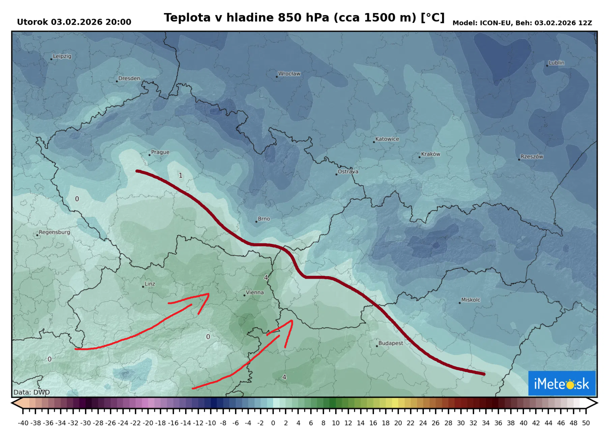 Práve v týchto chvíľach sa do vyšších vrstiev atmosféry nad západným Slovenskom dostáva veľmi teplý vzduch, ktorého teplota vo výške približne 1 500 metrov dosahuje až +4 °C. Dobre je to viditeľné aj na teplotnej mape v hladine 850 hPa.