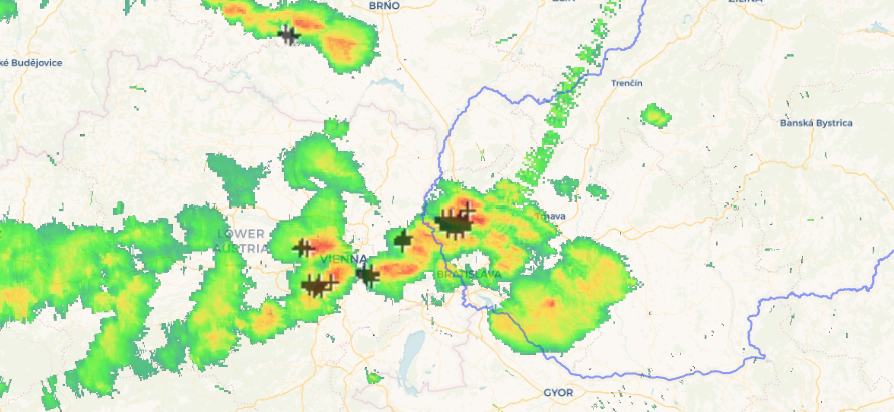 V týchto chvíľach sa vyskytuje dážď predovšetkým v oblasti Bratislavy, Záhoria a Pezinka. Nad východným Rakúskom, v oblasti rakúsko-slovenského pohraničia, začínajú vznikať ďalšie búrky.