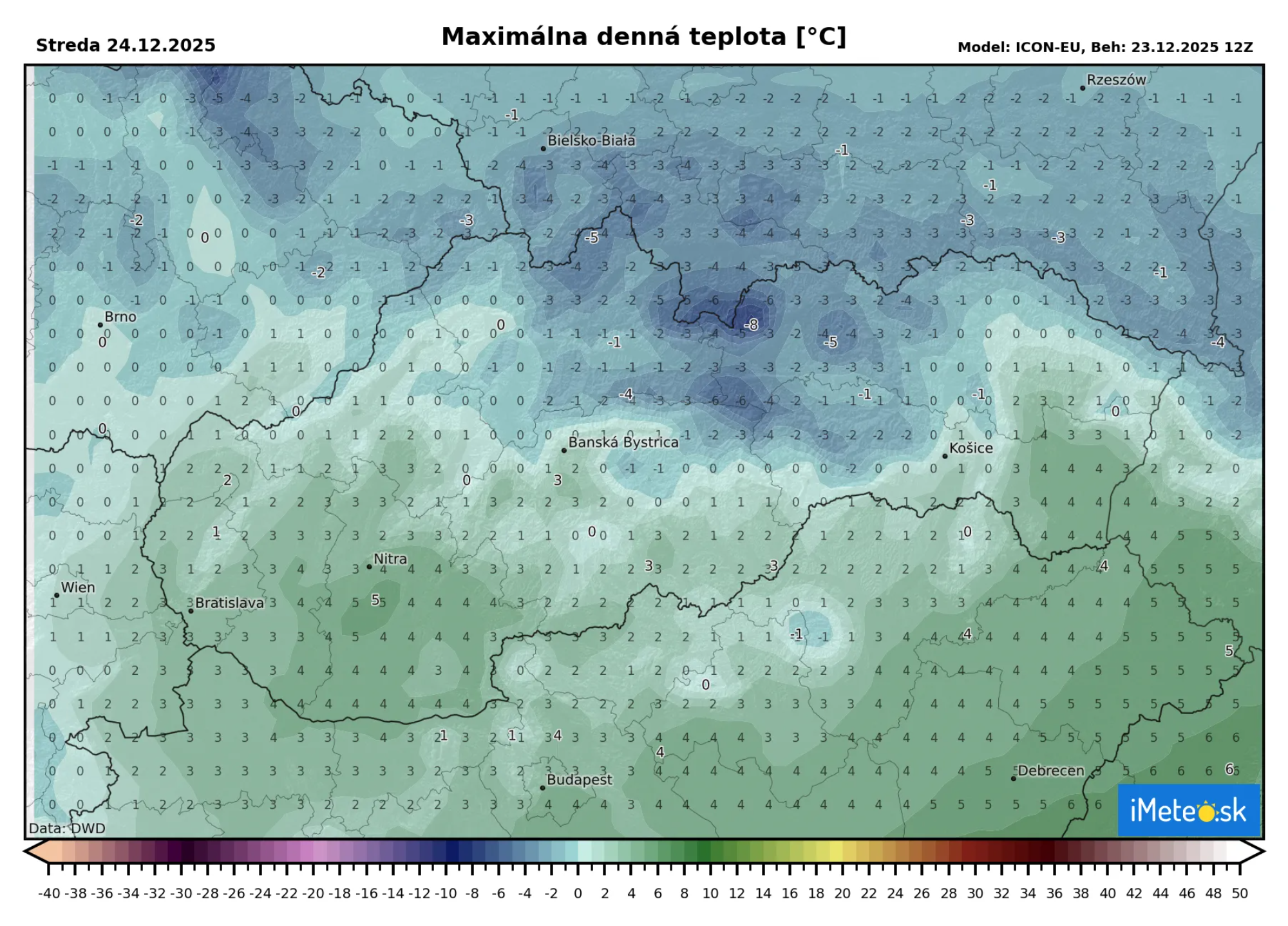 Na Štedrý deň sa snehové zrážky dostanú aj do ďalších častí Slovenska. Na severe sa do poludnia môže vytvoriť snehový poprašok, ktorý prinesie ako také biele Vianoce. Sneh by sa mohol udržať, nakoľko maximálne teploty sa dnes budú na severe pohybovať len okolo nuly, či pod nulou.
