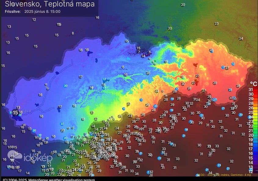Naopak, vo východnej polovici nášho územia máme aktuálne slnečné a veľmi teplé počasie, pri ktorom sa teploty dostávajú dokonca nad hranicu +30 °C. Na západe však máme poriadne odlišné teploty, ktoré sa pohybujú zväčša len okolo +15 °C. Na západe je tak až o 15 °C chladnejšie ako na východe.