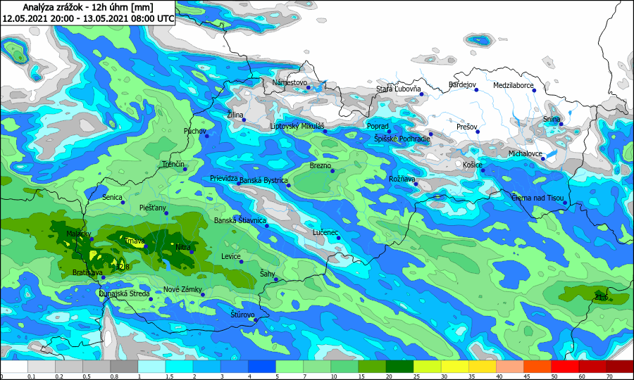 Za posledných 12 hodín napršalo k 10:00 najviac zrážok v Malackách a to až 38,2 mm. Prakticky v celej Podunajskej pahorkatine, na väčšine Podunajskej nížiny a v južnej polovici Záhoria spadlo od 10 do 30 mm.