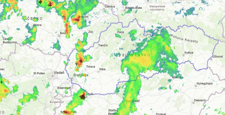 Medzičasom máme ďalšiu búrkovú bunku aj tesne za našimi juhozápadnými hranicami. Búrka postupuje k maďarskému mestu Gyor a nateraz kopíruje slovensko-maďarskú hranicu. V okolí Komárna by však mohla táto búrka našu hranicu aj prekročiť.