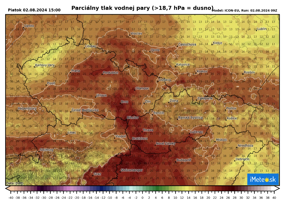 Vidieť to môžete aj na nižšie priloženej mape dusna. Hodnota parciálneho tlaku pre dusno je 18,7 hPa, ale na západnom Slovensku dosahuje parciálny tlak vodnej pary až hodnoty okolo 24 hPa.