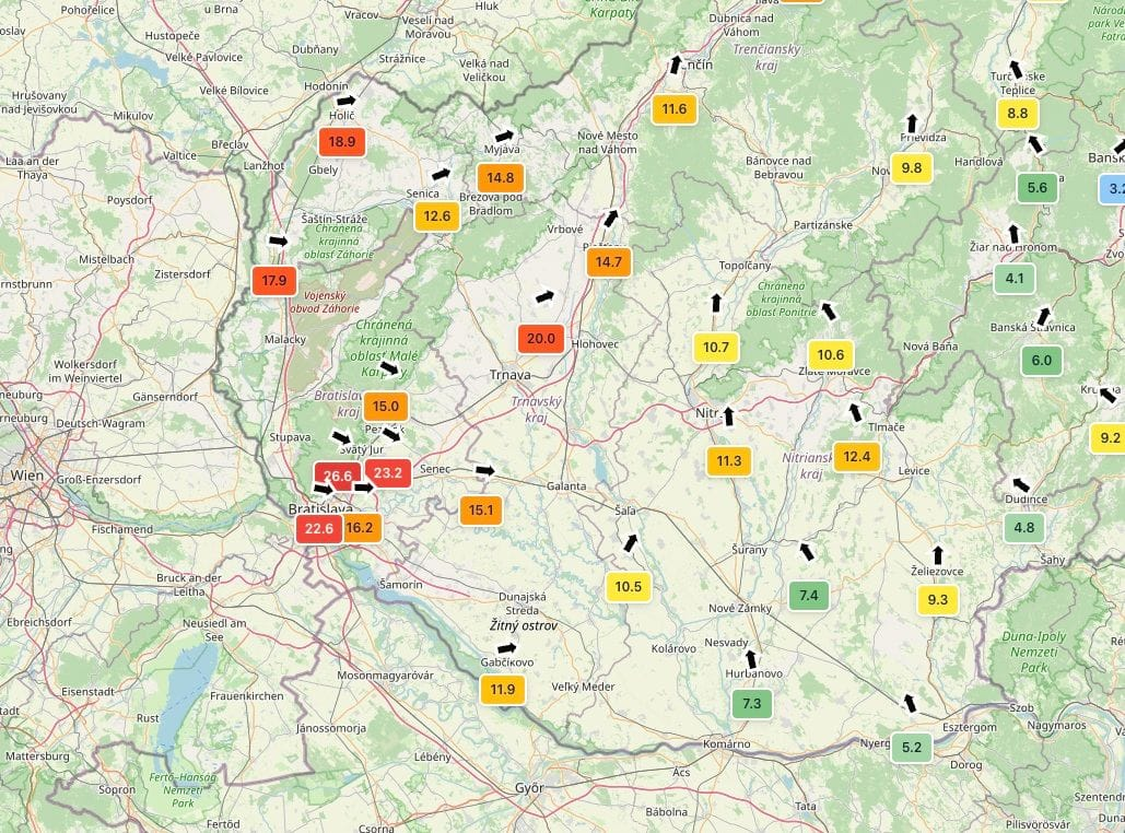 Ten je aktuálne najsilnejší na západnom Slovensku, kde poryvy vetra presahujú rýchlosť aj 70 km/h. Najveternejšie je v oblasti Malých Karpát a práve tu je aktuálne aj najviac problémov.