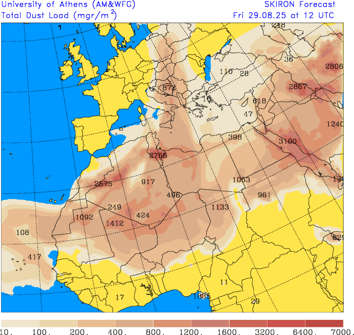 Podľa modelu SKIRON bude saharský prach po celý čas nad nami a čiastočky prachu môžu spôsobiť, že horúčavy budú o niečo miernejšie práve kvôli týmto čiastočkám vo vzduchu. Obloha bude zakalená a najmä pri východe a západe slnka môže nadobudnúť hnedastý nádych.