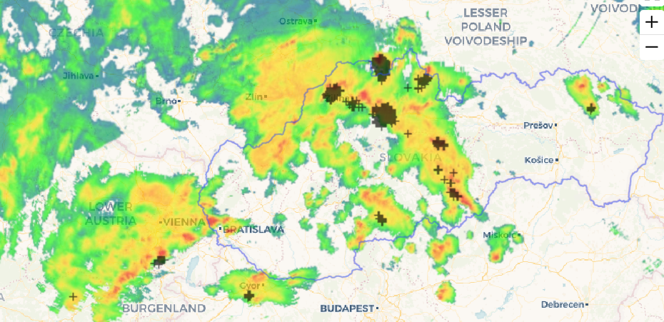 Aktuálne najsilnejšie búrky postupujú z Považia a Turca smerom na Oravu a Kysuce. Búrlivo je však aj na juhu stredného Slovenska a pár búrok sa objavuje aj na severovýchode či v Bratislave. Búrky aj tu prinášajú najmä zosilnený dážď.