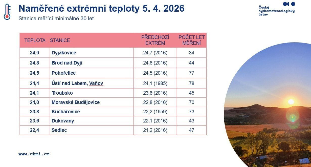 Podľa oficiálnych údajov Českého hydrometeorologického ústavu (ČHMÚ) sa absolútne najteplejším bodom stali Dyjakovice na Znojemsku, kde meteorológovia namerali neuveriteľných +24,9 °C, čím bol o 0,2 stupňa pokorený doterajší rekord z roku 2016.