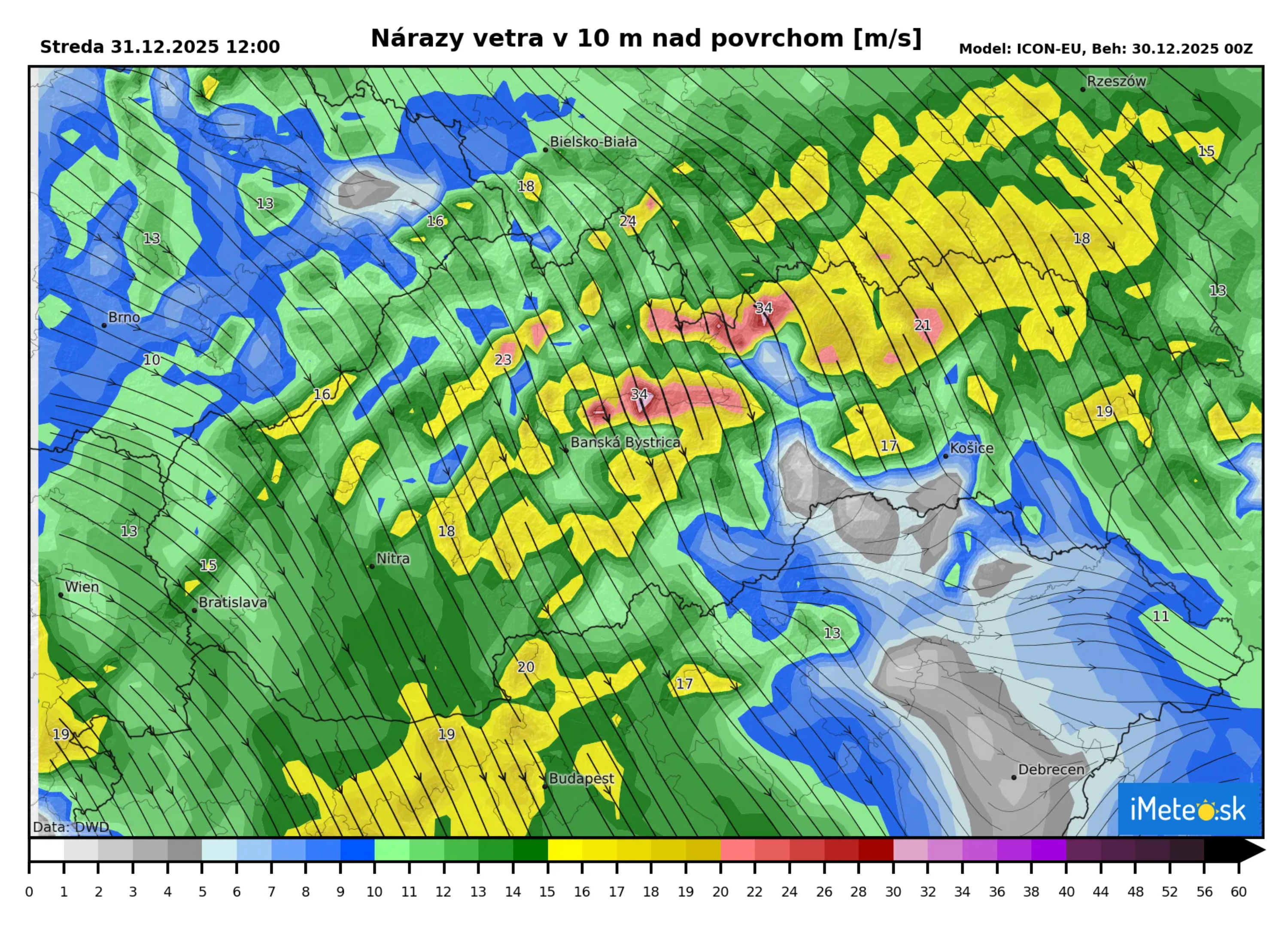 V týchto lokalitách sa predpokladá výskyt silnej až mohutnej víchrice, ktorá môže krátkodobo dosiahnuť rýchlosť 135 až 160 kilometrov za hodinu (km/h) a priemernú rýchlosť do 105 km/h.