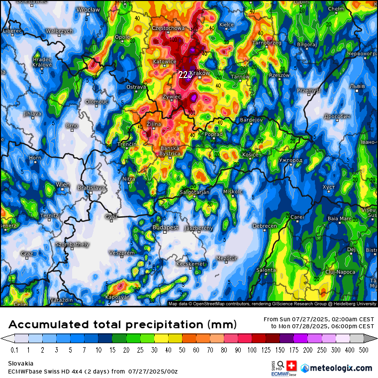 Podľa aktuálnych výstupov predpovedných modelov sa ťažisko celej zrážkovej situácie sústredí nad južné Poľsko a nad severné časti Slovenska.