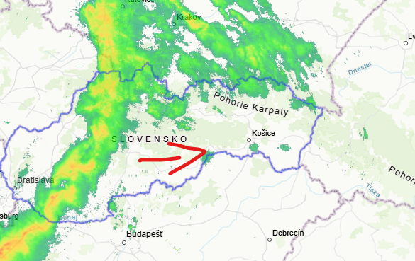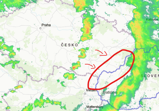 Pozornosť treba v nadchádzajúcich hodinách sústrediť na oblasť východnej Moravy, kde sa začínajú tvoriť prehánky a podľa aktuálnych nowcastingových modelov sa môžu vytvoriť aj búrky.