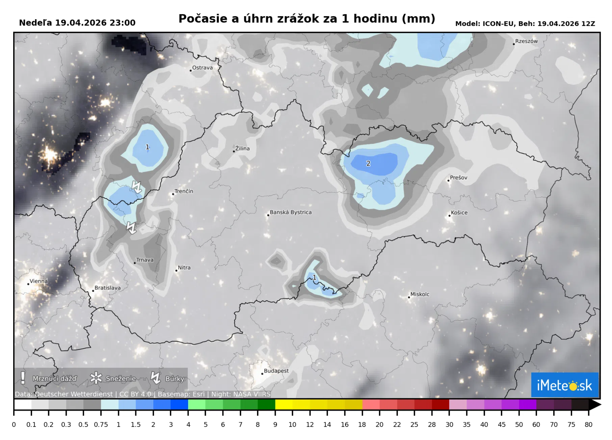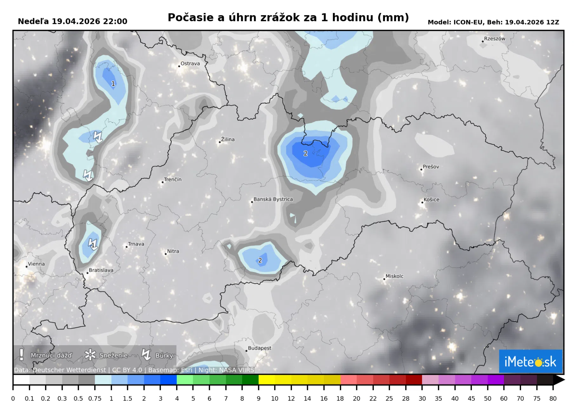 Práve podľa týchto výstupov je okolo 21:00 možný výskyt búrok v oblasti severozápadného Slovenska.