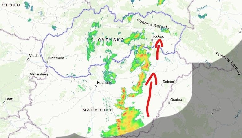 Nowcastingové predpovede naznačujú, že sa tak stane už okolo 23:30. Búrky z Maďarska dorazia do Košického kraja a následne budú postupovať východne od Prešova.
