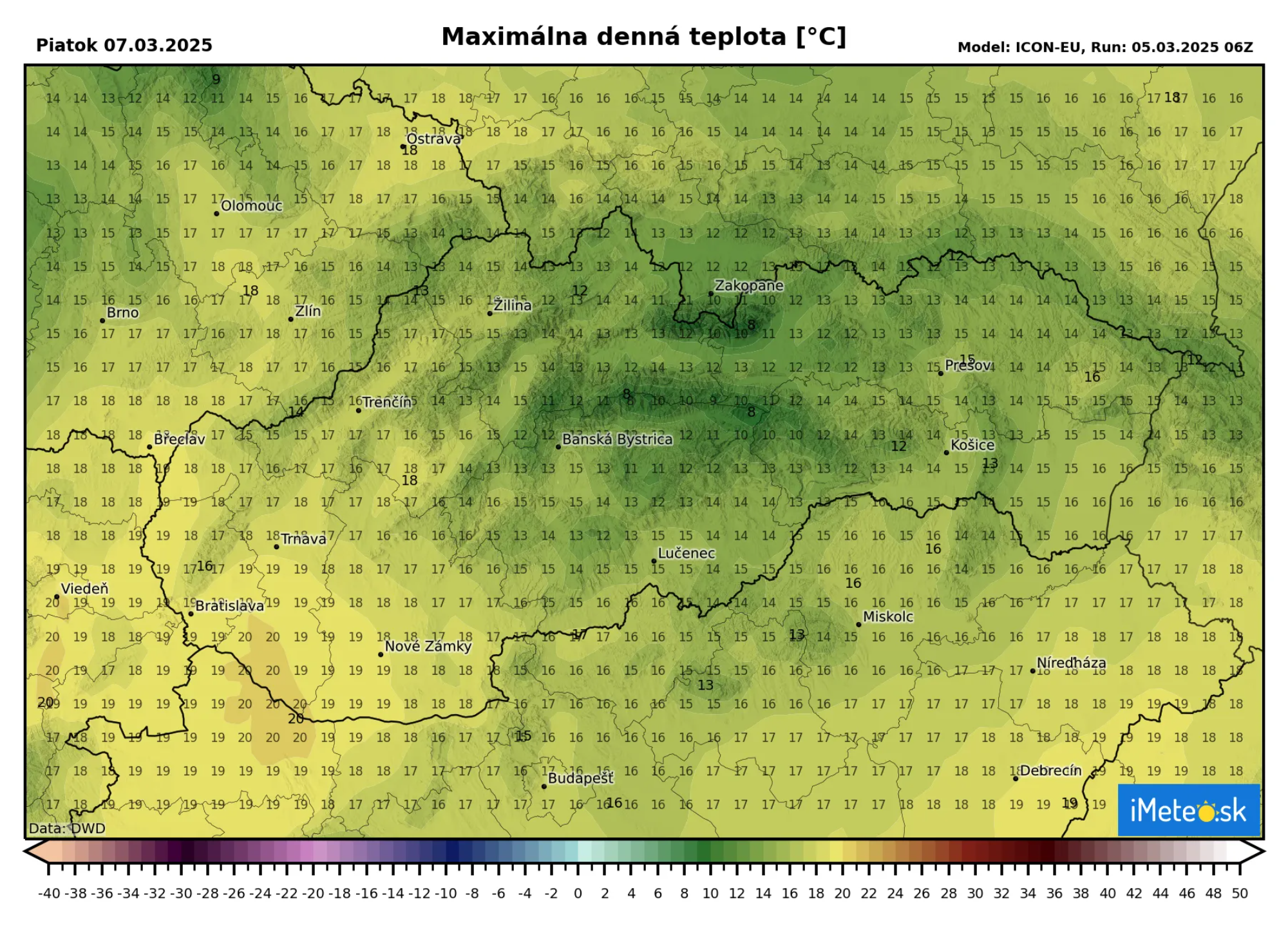 Maximálne denné teploty by sa na Slovensku mali v nadchádzajúcich dňoch pohybovať od +13 do +20 °C. V najteplejších regiónoch Slovenska je takmer isté, že teploty prelomia hranicu +20 °C.