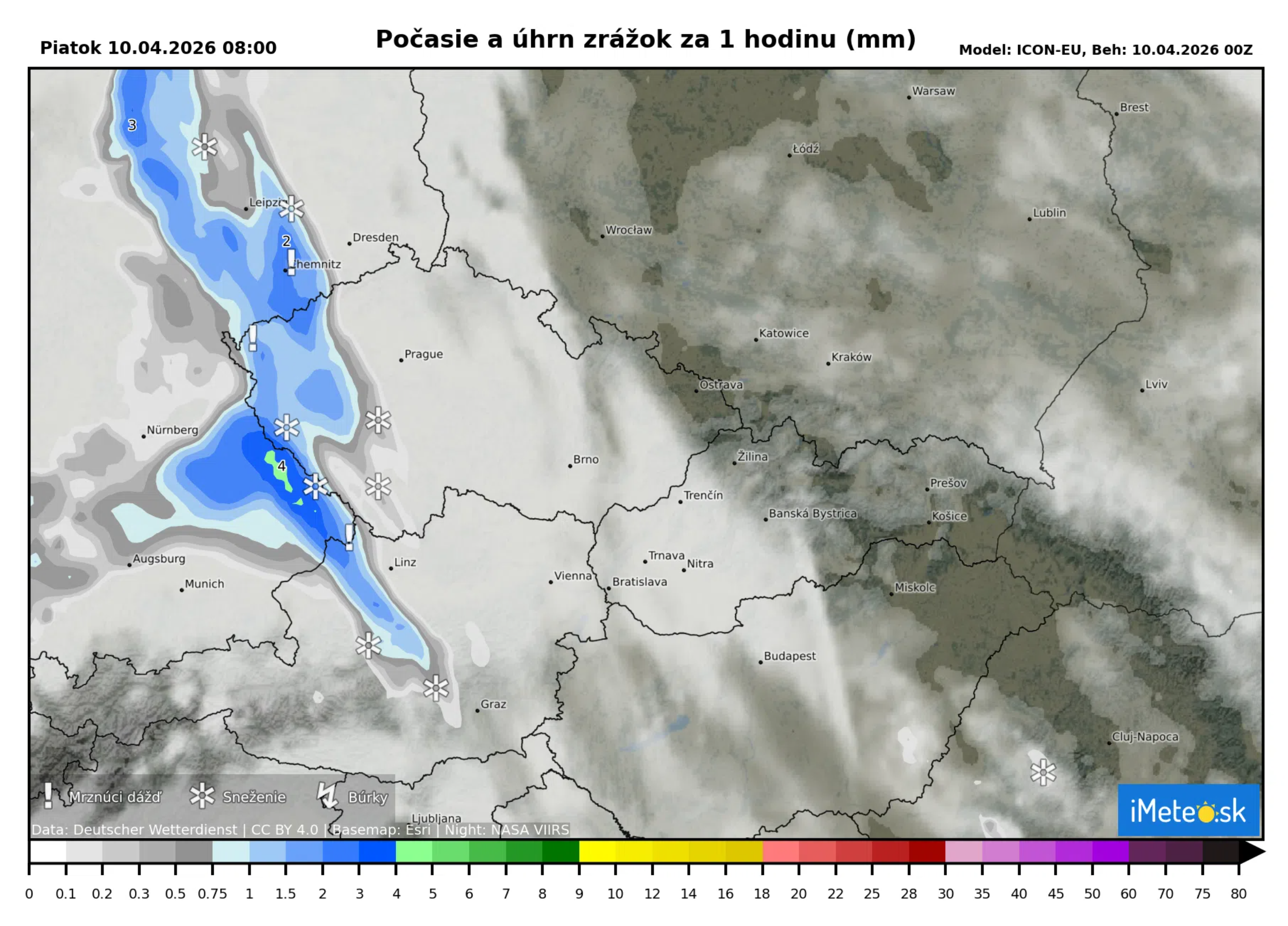 Zo západu prichádza výrazná zmena počasia – Nemeckom postupuje ďalej na východ front s búrkami, na západe Česka sa krátko pred 8:00 h začínajú v chladnom vzduchu meniť zrážky na sneženie alebo sneh s dažďom, okrem krajného západu Čiech, kam sa vo väčších výškach dostáva teplejší vzduch.